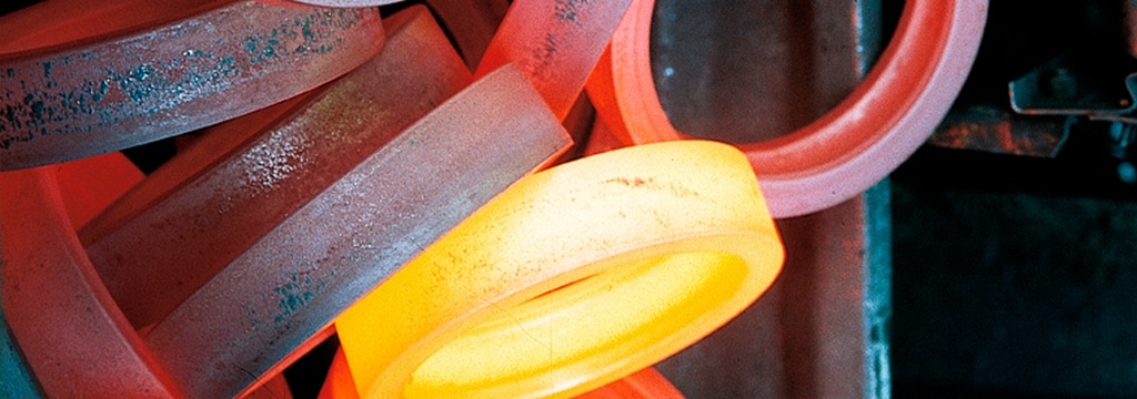 The ring rolling process starts with a circular preform of metal that has been previously upset and pierced (using the open die forging machines) to form a hollow “doughnut.” This doughnut is heated above 1000℃ temperature and placed over the idler or mandrel roll. This idler roll then moves under pressure toward a drive roll that continuously rotates to reduce the wall thickness, thereby increasing the diameters (I.D. and O.D.) of the resulting ring.
